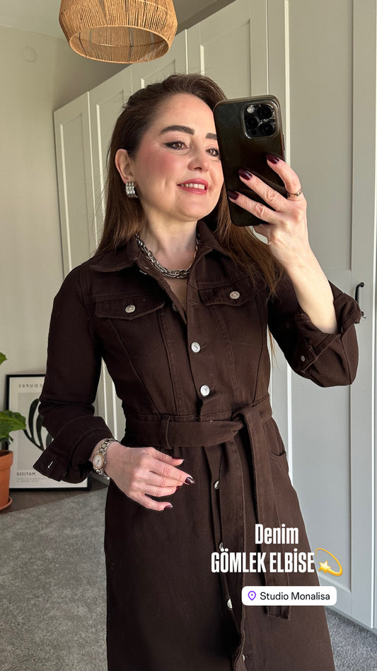 İndirimKemerli denim gömlek elbise