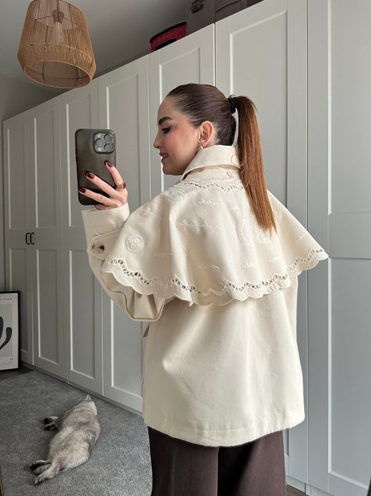 Beyaz iş pelerinli ceket (Pelerini çıkabilir )